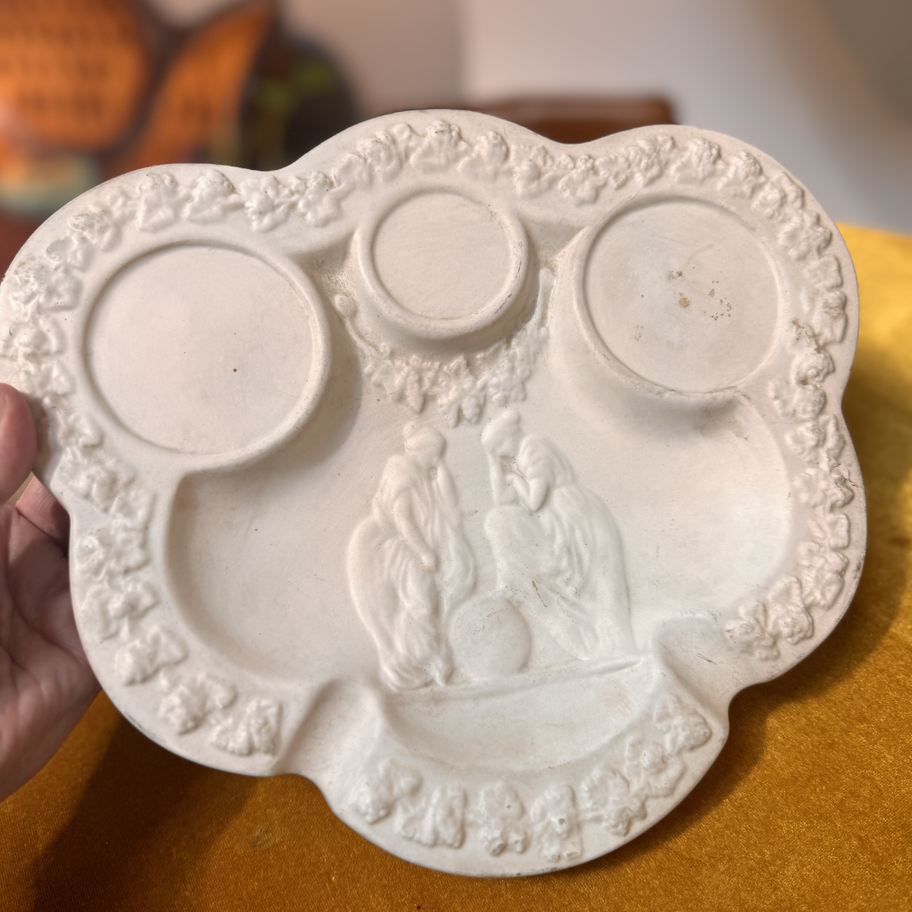 This beautiful Italian ceramic altar platform was made to order for it's owner who worked with the goddesses Diana and Demeter. They're meeting in the relief and there are three platforms for candle magick at the top. Truly unique piece.