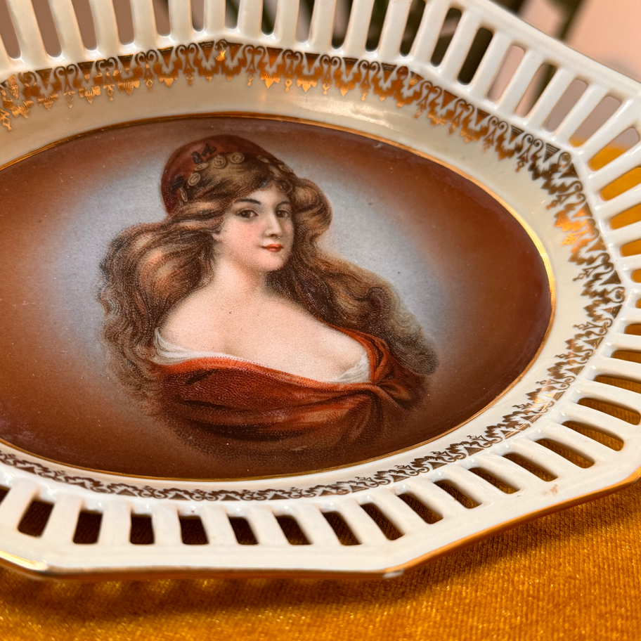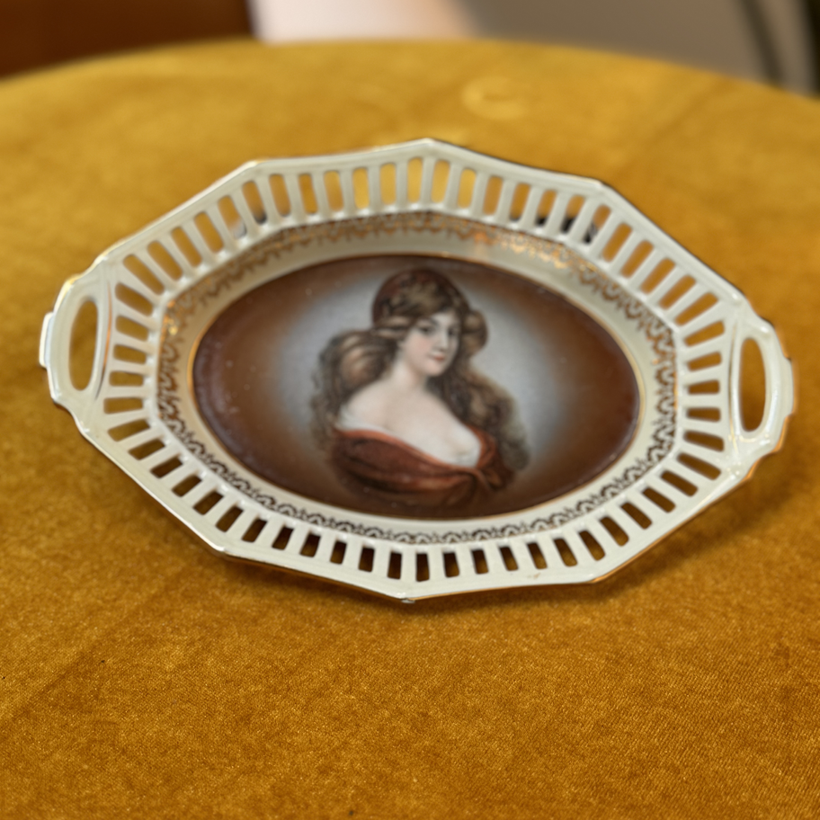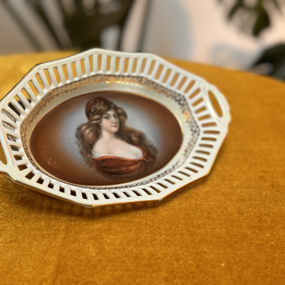 This gorgeous piece was found at an antique shoppe in Cologne Germany. This hand-painted goddess piece is refereshing & her gaze direct. She's perfect for holding your magickal talismans.